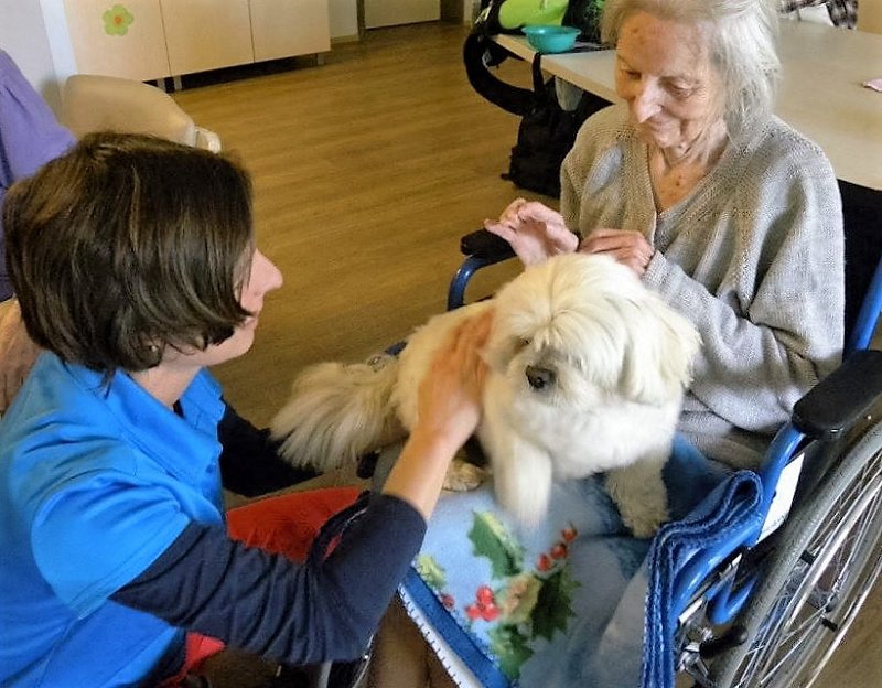 Animal Assisted Therapy (AAT) is a goal-oriented mediation, where dogs that meet specific criteria are an important part of the therapeutic process. The content of the programme – occupational therapy with the aid of dogs – is prepared by qualified professional staff (occupational therapists, physiotherapists, psychologists, social workers, speech therapists, etc.). The programme for a therapy session is carefully planned and is adapted to an individual client. The execution of the programme is then regularly recorded, taking into account the criteria for progress. The session lasts from 30 to 40 minutes with breaks in between for the dog.